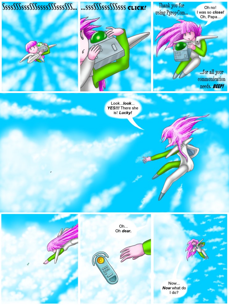 PAGE FOOTNOTES: Our minds compute scale based on reference to background and surroundings. Against the backdrop of an infinite void, such as the sky, scale is literally impossible to judge. The best any person can do is recognize a known object, and remember the size of it. If the distance to the object is known, then it is possible to use two seperate viewpoints to compute scale, but poor Heliotrope does not have a partner out there in the clouds, and in any case, she has no way to know exact distance. Misjudging scale is easy in such a case.