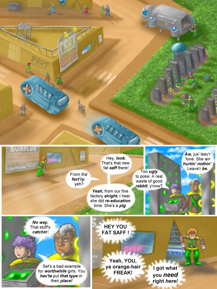 PAGE FOOTNOTES: Back when I was holding down several jobs in my 20's, I had to walk past many a construction site. I quickly learned to cringe, to hold my head down and grit my teeth as I hurried past. I am only guessing at what motivates supposedly grown men to act this way, but I cannot imagine any woman ever escaping experiencing some variation on this crap at some point in her life. When it happened to me, I had daydreams of seeing my tormentors beaten and butchered, tortured and punished.