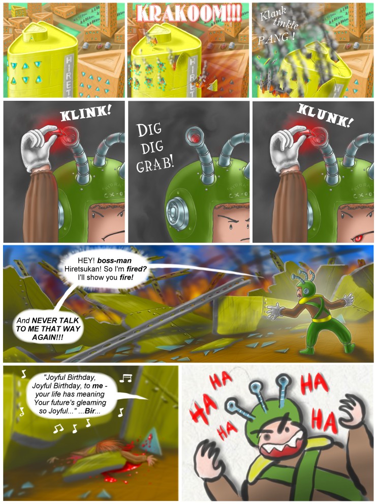 "...You're right, boss-man Hiretsukan, my services WON'T be required tomorrow! Fired? I'll show you FIRE! ... It was a crappy job, and a crappy boss too... That damn Hiretsukan had it COMING! I worked my ASS off for that guy, and he fires me on my BIRTHDAY! " |