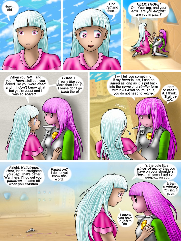 PAGE FOOTNOTES: Although they have only met today, a death scare compounding waking up from being in an altered state of consciousness is surely enough for poor Fuschia to lose her self control and get a little clingy and foreward. It has been a weird day for her...from flying about in a newswagon, being confronted about her personal secrets, and having love at first sight, as well as the shock of seemingly losing that same love almost immediately...frankly it's a wonder she isn't babbling like a loon by this point, even without CURSOR's interference. I know I would be.