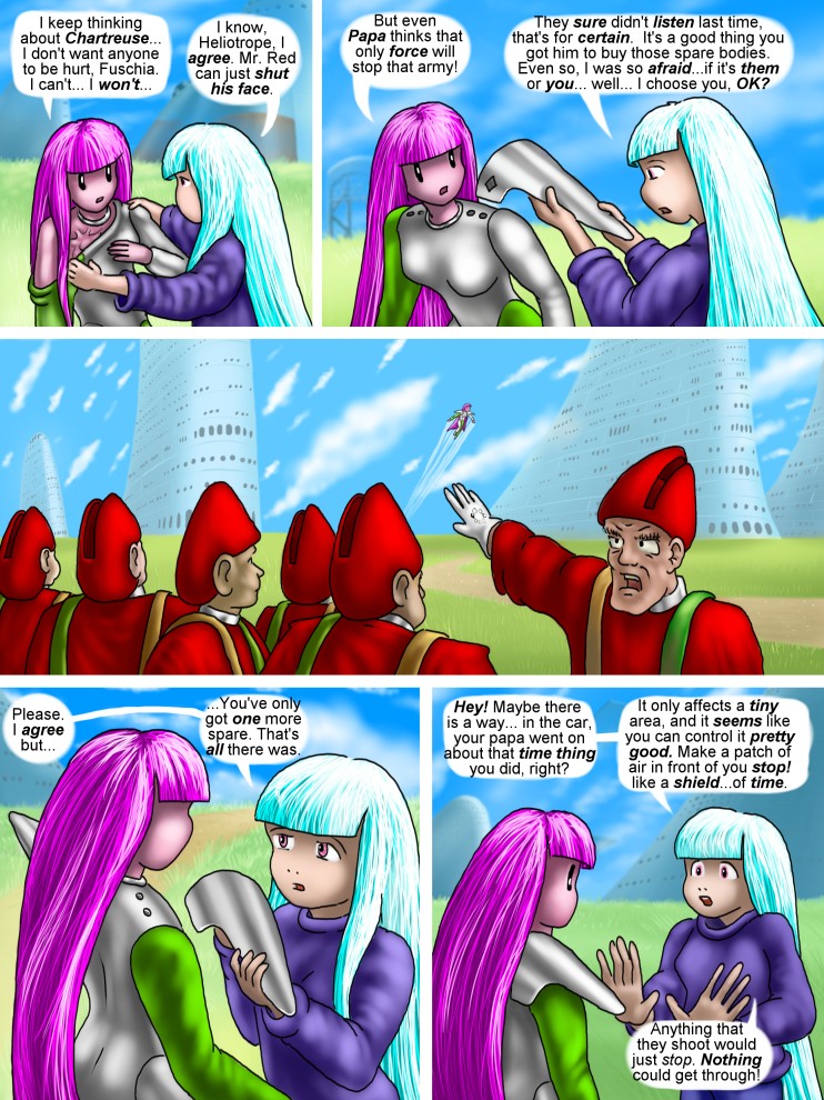 PAGE FOOTNOTES: Some readers have speculated that a better solution would be to use the time stop capability to have Heliotrope run about and take the weapons away from all of the Church Army soldiers, while she was outside of time. The metatemporal field that Heliotrope generated previously to play on the swings with her papa was essentially a spherical bubble about four meters in diameter, centered on the Omnipitor. Anything inside the space of that bubble shares in excluded time, which is why the swings could still be used, and why she could even just manage to walk about through the air at all.