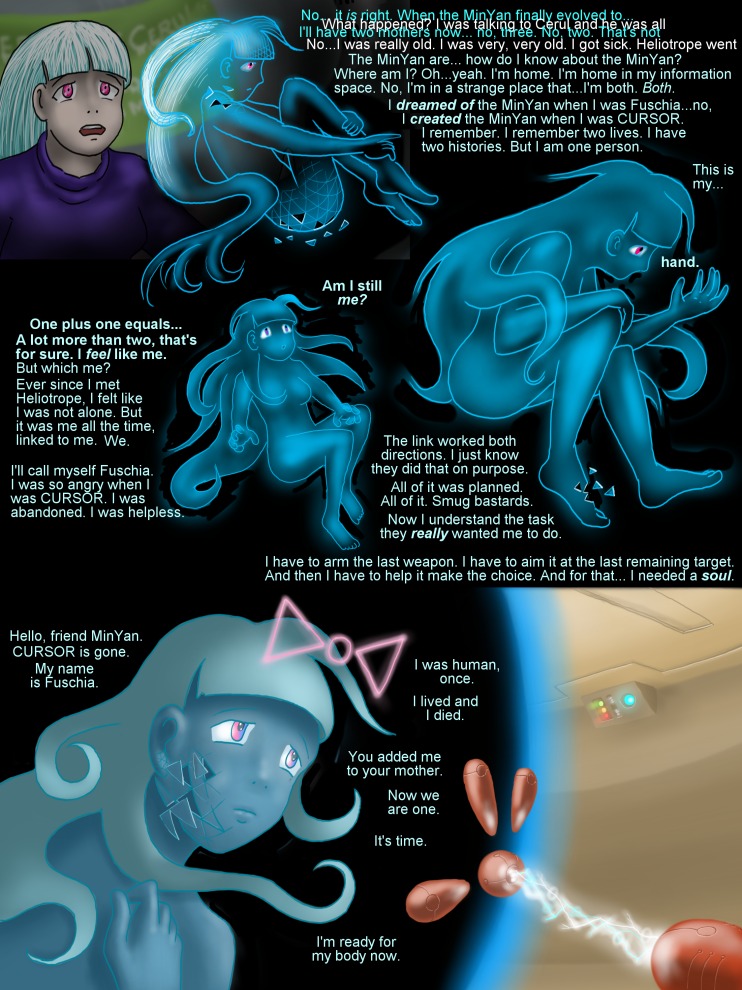 PAGE FOOTNOTES: If someday it becomes possible to upload human minds into some sort of computer like device and run a mind in some sort of emulator, a number of complexities arise. What happens if you merge the data of two minds? Is it either of the same people, or someone new? What if one side of the merging is dominant - does that make the result more one person than the other? Can personhood be defined on a sliding scale?