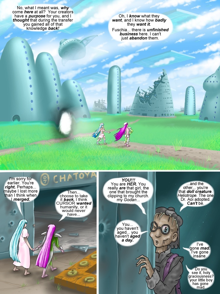 PAGE FOOTNOTES: Aging little Theodicys Celedon was an interesting task here - I needed him to be recognizably himself, despite extreme age. He would, at this point, be just a little older than organic-version Fuschia Shiro within this time period, which would be around the age of eighty-five or so. Fuschia is currently temporally folded, for those that are fascinated by such matters; at this point in the time axis she exists twice - her old organic self is still alive on the distant frontier colony of Cerulia, sitting in her favorite neoplastic chair (just the same as Heliotrope's body!) knitting a heliotrope-colored cap to cover her lover's ever-thinning hair. They have re-entered Pastel about a week before Fuschia dies / died / will-die.