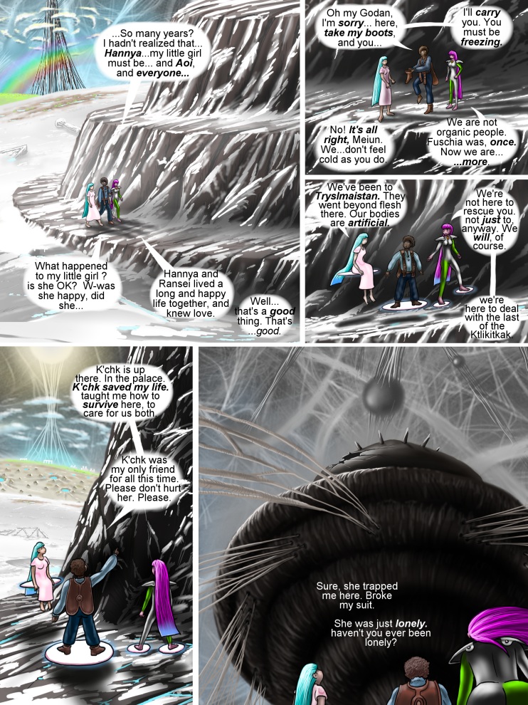 PAGE FOOTNOTES:  The title is, of course, a reference to Stockholm Syndrome, where a prisoner may, after sufficient time, begin to identify with his captors. Meiun has been kept, against his will, and indeed was taken in a fairly violent incident - one that caused Dr. Aoi to attempt to destroy the power of the core of the Introitus system, the ancestral luggage, to eliminate use of the machine so as to prevent a full-scale invasion of Pastel. Now we see Meiun defending his captor, the last of the Ktlikikak. He has been there, with only her in all the universe, for a very, very, very long time.