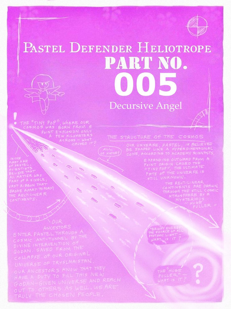 It is believed that, perhaps a billion years in the past, the whole cosmos of Pastel sprang from a single point, called the 'Tiny Pop', an explosion of universe-creating force contained within a space no larger than two kilometers. From the mysterious 'Tiny Pop', the cosmos continues to expand outward in the shape of a hyperdimensional cone. Pastellian science believes that all the matter in the universe formed from the Tiny Pop acting on the multiversal background during the initial expansion, and the result was a ribbon of matter streaming forth. This ribbon of matter began to fragment along rectangular crystalline boundaries, to form the flying rectilinear continents of Pastel. It is believed that the initial state of the cosmos was much lower in temperature at this time.