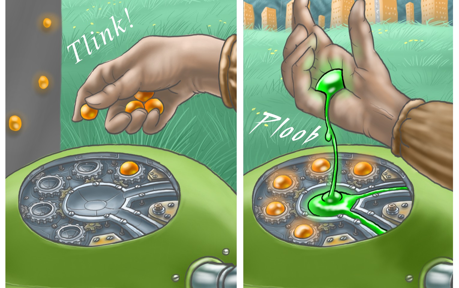 The inner workings of the CX-01 "Hydra" Crimson Attack Helmet. Note the use of Chatoyant Orange as rotational 'motors' and Chatoyant Green as interior wiring, serving the same function as electrical wires, only transmitting and amplifying kinetic energy (as from a dial control) directly. Before the fresh Chatoyant Concretons eventually become used up, dry, and crumbly, they must be removed and replaced with new Concretons. This is why the dial-panels are so easily removed and provide such complete access to the Chatoyance machinery.
