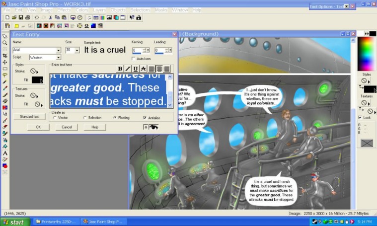 Once the word balloons are complete, I then move into Paint Shop Pro 7, because for all I enjoy Alias Sketchpad, it lacks one single important thing: the ability to place text. If Alias just had that one feature, I think I would have little need for any other paint program right now. I use Arial for my main font set to size 30. Some people complain about comics that use basic fonts like Arial, but frankly, I do not see the problem...Arial is extremely easy to read, is clear and precise, and has no connection to any specific time period...it makes a fine timeless font. I personally object to comics using fonts that are overly styled, because it reduces readability. I am not opposed to styled fonts per se, indeed a styled font can evoke mood and a sense of time and place... I just think they need to be easily readable. That comes first for me, and if there is ever a question about the issue, I will always default to the most readable font I can for a given situation, and let the art carry the time and place. I reason it this way; if the audience cannot read your text, you have no story.