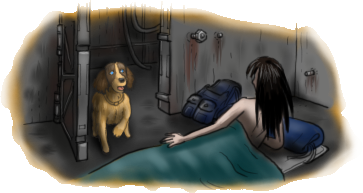 The grateful dog's enhanced eyes gazed through the deep gloom at his newly chosen companion. She was tall, sleek and youthful. Her face had the deep, leathery tan of the homeless. Her long, dark hair behaved as it wished. The dog didin't understand much about how she looked. But she smelled like a person who went to a lot of different and interesting places.