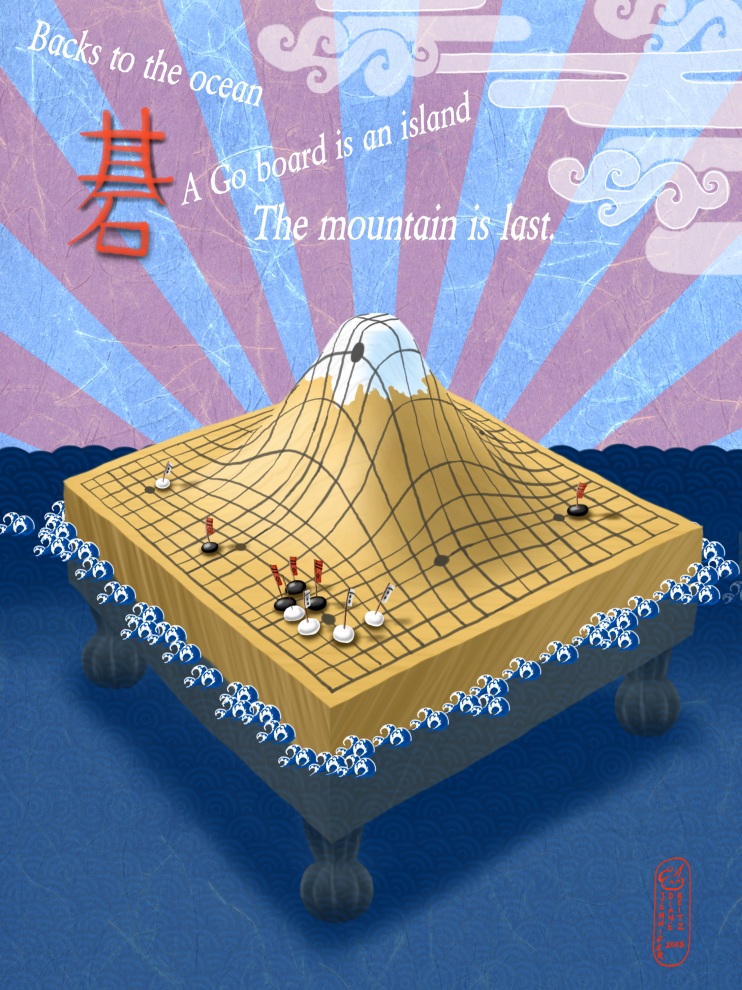 Go is one of my favorite games, and I prefer it to chess. Where chess is a small-scale tactical battle between two opposing armies, Go is a large-scale strategic conflict where every playing piece, or stone, represents a single army. This painting consolidates how I envision the abstract Go board when I formulate my overall strategy within the game. For me, the lines are roads, the intersections are small towns and villages, and the star points are important capital cities with great influence on the surrounding land. The center of the board is the highlands, the edges the seacoast.